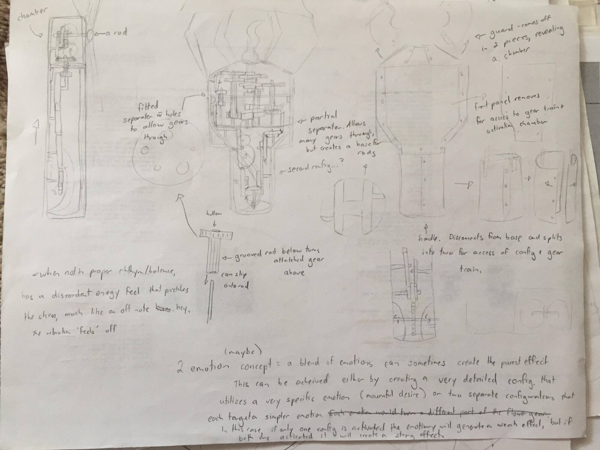 This process was not aided by the fact that I am not mechanically minded. While I envisioned emotionry making use of gears in a cool way, I didn't really know how to incorporate them practically. I spent hours researching gears and related topics, but though the concepts made sense at the time, I struggled to apply them to emotionry.