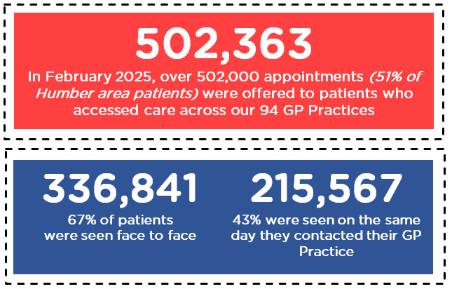 Appointments data from NHS Digital shows there were over 502,000 general practice appointments in the Humber area in February 2025. Download a one page summary which can be displayed in practices here.